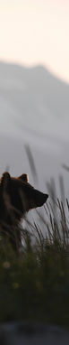 A coastal brown bear sits amongst the grass during sunset in Katmai, Alaska.