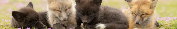A skulk of red fox kits take an afternoon nap among a flower filled meadow in Washington state.