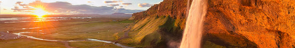 Seljalandsfoss lights up in the glow of the sunset along the south coast of Iceland.