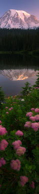 Wildflowers illuminate the egde of an alpine lake in Mount Rainier National Park, Washington.